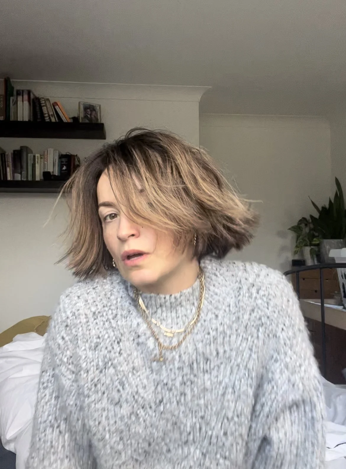 Within three minutes of sitting down, a 10-year-old, 15-inch plait lay on the floor. My stylist couldn’t have been more excited—or less emotionally prepared—for what this meant. I braced for sadness… but as I watched it be swept away, I knew I wouldn’t miss it. I felt a little numb—and a lot liberated. This was me now. My middle years. My mum self. My neck and jawline!